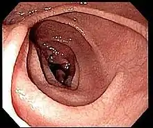 Most people with coeliac disease have a small intestine that appears to be normal on endoscopy before the biopsies are examined. However, five findings have been associated with high specificity for coeliac disease: scalloping of the small bowel folds (pictured), paucity in the folds, a mosaic pattern to the mucosa (described as a "cracked-mud" appearance), prominence of the submucosa blood vessels, and a nodular pattern to the mucosa.[95]
