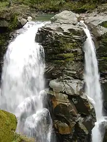 Nooksack Falls is a waterfall along the North Fork of the Nooksack River in Whatcom County, Washington. The water flows through a narrow valley and drops freely 88 feet into a deep rocky river canyon. The falls are viewable from the forested cover near the cliffs edge. The falls are a short 2/3 of a mile drive off the Mount Baker Highway, Washington (State Route 542).[1] The falls were featured in the hunting scene of the movie The Deer Hunter.