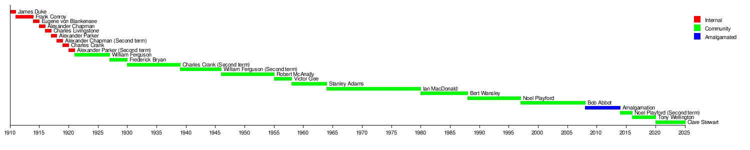 | Clare Stewart | 2020–present | Independent | Mayor | [25] |