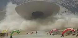 Caltech professor John O. Dabiri collaborated with Peele and his team on the design of the Jean Jacket creature's UFO form,[43] and in particular its final true "biblical angel" form, which was inspired by those of Neon Genesis Evangelion and sea creatures such as jellyfish, octopuses and squid, to imagine a hypothetical undiscovered previously extinct sky predator, realistically imagining "how could something like this hide in the clouds", with its ability to "generate electric field" taken from electric eels and ghost knifefish, allowing for electric propulsion ("Jean Jacket's fast flying without wings/sails").[44][45][46] Guillaume Rocheron of Moving Picture Company (MPC) also worked with Dabiri and Peele on the visual effects shots featuring Jean Jacket, utilizing both CGI and practical effects, the latter particularly involving the use of a helicopter to swirl the dust and dirt on the ground the way the creature does when consuming its victims in the film.[47] The film held its first test screenings just 12 weeks before its July 22 release, with the special effects still being worked on.[48]