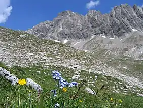 ![]() Alpine flowers in front of the Noppenspitze's southwestern flank | |