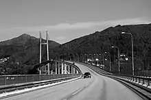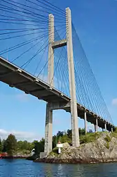 The Nordhordland Bridge (Norwegian: Nordhordlandsbrua) is a combined cable-stayed and pontoon bridge which crosses Salhusfjorden between Klauvaneset (in Bergen Municipality) and the island of Flatøy (in Alver Municipality) in Vestland county, Norway. It is 1,614 meters (5,295 ft) long, of which the pontoon section is 1,246 meters (4,088 ft) long. The cable-stayed section consists of a single 99-meter (325 ft) tall H-pylon which has a length of 368 meters (1,207 ft) and a main span of 172 meters (564 ft). This allows for a clearance of 32 meters (105 ft).