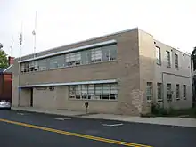 The Registry was originally housed in one of the first floor rooms of the home of Eliphalet Pond, the first registrar, at 963 Washington Street in Dedham.[12] A sign was nailed to a tree out front informing the public of its location.[12] It then moved to the original Norfolk County Courthouse and remained there for about three decades.[12] When the new Norfolk County Courthouse was built in 1827, the middle office on the west side of the lower level was used by the Registry.[12] When the population of the county grew and the number of real estate transactions increased apace, a new building was constructed for the Registry across the street at 649 High Street.[12] The Boston firm Peabody & Stearns was hired to design the current Registry of Deeds, built in 1905. The main section of the building measures 52 feet by 186 feet, is two stories high with a copper hipped roof, and is built of Indiana limestone with details made of granite from Deer Isle, Maine.[13]