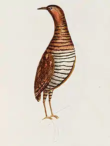 The Norfolk Island rail is described as a flightless brown rail with a white breast and stripes running down its body. The illustration from the Album of Watercolour Drawings of Australian Natural History is thought to represent this bird. It was noted to be an especially shy bird.[2] It was hunted by falcons and owls, which likely played a part in its extinction.[3] The Norfolk Island rail is thought to have been herbivorous and to wade through water.[2] It likely went extinct around 1800 after the illustration was created, but may have become extinct long before. It is known to have had a small population and was rarely seen.[2]