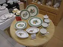 In 1904, key members of this trading company created the Nippon Toki Kaisha, Ltd. ("the Company that makes Japan's Finest China") in Japan.[5] A new factory was built in Noritake, near Nagoya (now Noritake-shinmachi, Nishi-ku, Nagoya, Aichi). In 1914 the company succeeded in creating their first Western style dinner set, called "Sedan", to compete with European porcelain companies.[3][4] Nippon Toki wares were mostly aimed at the European Market. This forerunner of the modern Noritake Company was founded in the village of Noritake, a small suburb near Nagoya, Japan. Most of the company’s early wares carried one of the various “Nippon” back stamps to indicate its country of origin when exported to Western markets.[5] Today, many collectors agree that the best examples of “Nippon-era” (1891–1921) hand painted porcelain carry a back stamp used by "Noritake" during the Nippon era.