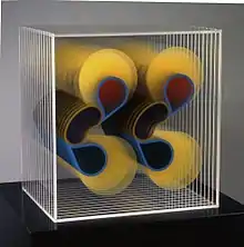 "The anatomical fragments change their character at the point of contacting the invisible planes of the geometric box walls. At such point a hip shape will turn a different color…There is a sensation-seeking aspect to this work which may be related to the researches of so called neo-Dada. There is also a serious commentary in relation to isolation, interior emptiness." — Arts Magazine, Gerald Nordland, October 1962[10]