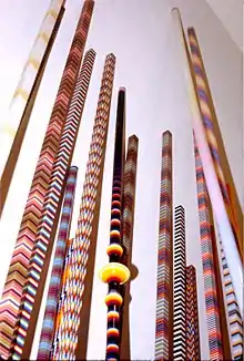 These sculptures, 8’-10’ in length, 1 ¼" square, round, octagonal, hexagonal or spindled, were constructed with solid color acrylics in an order of color frequencies, then laminated and polished. The final pole combined the transparent, translucent and opaque in a combination varying from matte to high gloss.