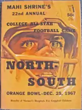 The North–South Shrine Game was an annual postseason college football all-star game played each December from 1948 to 1973 in Miami, and a final time in 1976 in Pontiac, Michigan.[1] The game was sponsored by the fraternal group Shriners International, with proceeds used to support the Shriners Hospitals for Crippled Children. The full name of the game when played in Miami, as listed on programs, was the Mahi Shrine's North–South College All-Star Football Game.