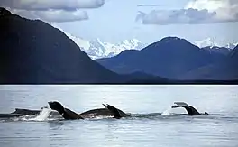 The fjordland is connected through oceanographic processes utilizing nutrients and productivity from the North Pacific, and the waterways are critical habitat for substantial Northern Pacific cetacean populations, including fin whales, orca, and humpback whales.[3] Major features include the Inside Passage, a coastal route for ships and boats weaving through a network of passages among the many fjordland islands.
