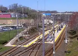 North Avenue station is a Baltimore Light Rail station located on North Avenue (US 1) near the I-83 interchange in Baltimore, Maryland. The station has two island platforms serving three tracks.