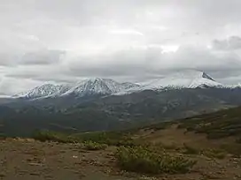 There are taiga forests of conifers, mostly larch, in the slopes of the mountains. At higher altitudes there is mountain tundra. Further up the mountaintops are either flat or topped by golets-type bare rocky summits.[2]