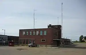 The North Battleford station is a former railway station in North Battleford, Saskatchewan. It was built by the Canadian National Railway in 1956 and used as a passenger terminal. North Battleford no longer receives scheduled passenger rail service (the closest stations are now served by Via Rail station to the south in Biggar and Unity), and the station is now used as office space for CNR, and was once the intercity bus terminal.[1]