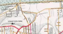 The station was located at the foot of the Bergen Hill at Paterson Plank Road west what is now Tonnele Avenue. The village then known as Homestead lay on western slope of lower Hudson Palisades below Schuetzen Park.[3] The abutting village of New Durham was to the north; an eponymous station was located at what is now 50th Street adjacent to North Bergen Yard and the present day terminus of the Hudson–Bergen Light Rail at Tonnelle Avenue. Babbitt, the northernmost station in the township, was at 83rd Street.[4]