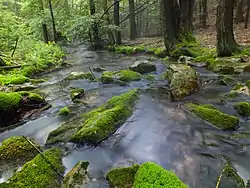 The waters of a stream in the watershed of North Branch Buffalo Creek in The Hook Natural Area are a dark amber color. This coloration is caused by decaying organic matter in the groundwater that flows into the creek.[6]