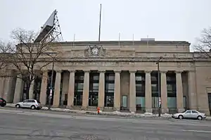 In 1928, facing competition from the impending completion of the Broad Street Line, the Reading decided to replace Huntingdon Street station with a larger station to rival the PRR's nearby North Philadelphia station. Groundbreaking for Broad Street station was held on July 31, 1928 and demolition of Huntingdon Street station began immediately.[9] The classical revival station, designed by Horace Trumbauer, opened as North Broad Street in 1929.[10] The station featured two island platforms which served all four tracks, connected by an underground walkway to the station, street, and the Broad Street Line's North Philadelphia station.[11] Its grand design reflected pre-Great Depression optimism and plans for redevelopment of the surrounding neighborhood.[10]