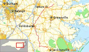 North Carolina Highway 111 (NC 111) is a 126.0-mile-long (202.8 km) primary state highway in the U.S. state of North Carolina. Traveling north–south through Eastern North Carolina, it connects the various rural towns and communities with the cities of Jacksonville (via U.S. Route 258 (US 258) and NC 24), Goldsboro and Tarboro.