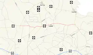 The western terminus of the highway is NC 111. Traveling east 2.5-mile (4.0 km), the highway beings a brief 1.1-mile (1.8 km) concurrency with NC 42 and joins the Tar Heel Trace scenic byway.[2] NC 42 departs the route at the NC 11 intersection, NC 142 continues 1.4-mile (2.3 km) to the rural community of Hassell. Leaving Hassell to the east, NC 142 terminates after 3.7-mile (6.0 km) with the NC 125/NC 903 junction. The Tar Heel Trace continues southbound on NC 125.