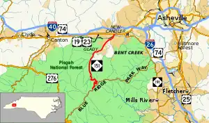 NC 151 has its southern end at the Blue Ridge Parkway near Mount Pisgah and briefly parallels the parkway for the first two miles (3.2 km) before turning west. Shortly after, NC 151 turns back north. NC 151 travels north, passing through Stony Fork then South Hominy as it turns northeast. NC 151 also passes through Glady before reaching the unincorporated community of Candler as it nears its end. At 11.83 miles (19.04 km), NC 151 reaches its northern terminus at U.S. Route 19 (US 19) and US 23 (Smokey Park Highway) in Enka.[1][2]