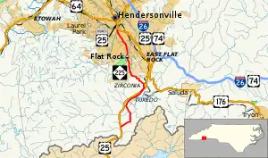NC 225 is a two-lane rural highway that travels along a former routing of US 25 in Henderson County. Beginning along Bobs Creek Road and US 25 (exit 1), it goes east and then north along Old US Highway 25. Crossing the Green River, it enters the community of Tuxedo, wedged between US 25 and Lake Summit. At Zirconia, it crosses underneath US 25 (exit 5) continuing north through the village of Flat Rock. In Hendersonville, it ends at the intersection of South Main Street (US 25 Business) and Spartanburg Highway (US 176). This point also marks the western terminus for US 176.[1]
