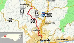 North Carolina Highway 251 (NC 251) is a north/south state highway in western North Carolina. Its southern terminus at an interchange with U.S. Route 19 (US 19), US 23, and US 70 (future Interstate 26 or I-26) on the border of Asheville and Woodfin. The road largely follows the east bank of the French Broad River until its northern terminus at US 25/US 70 near Marshall in Madison County.