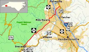 Although the highway runs primarily through rural farming and residential areas for most of its length, the stretch between Fanning Bridge Road and US 25 currently represents the most developed section of the highway. A growing number of national retailers, restaurants, and hotels can be found within a half-mile of the I-26/US 74 interchange.[3][4] Landmarks along this section of highway include Asheville Regional Airport and the WNC Agricultural Center, site of the annual North Carolina Mountain State Fair. For 10.1 miles (16.3 km) of its path through Transylvania and Henderson counties, the highway runs adjacent to the eastern boundary of Pisgah National Forest.[1]