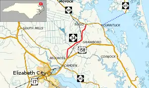 North Carolina Highway 34 (NC 34) is a short primary state highway in the U.S. state of North Carolina. Spanning a distance of 9.177 miles (14.769 km), the route passes through a few small unincorporated communities in eastern North Carolina's Inner Banks near Elizabeth City.
