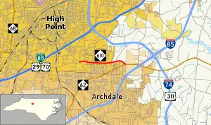 North Carolina Highway 610 (NC 610) is a 2.1-mile-long (3.4 km) primary state highway in the U.S. state of North Carolina. The highway connects Main Street in southern High Point with North Carolina Highway 62 east of Archdale. The highway provides indirect access between High Point and Interstate 85/Interstate 74. The current highway was established in 1930 and its routing has remained unchanged since.
