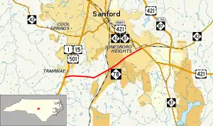 NC 78 is a 4.6-mile (7.4 km) two-lane highway, traversing from US 1/US 15/US 501 in Tramway, to US 421 Business/NC 42/NC 87 in Jonesboro Heights. The routing provides a southern bypass of downtown Sanford.