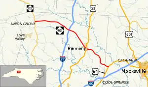 North Carolina Highway 901 (NC 901) is a primary state highway in the U.S. state of North Carolina. The highway serves to connect the town of Harmony with nearby major highways.