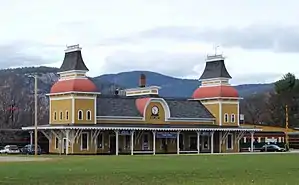 North Conway station is a railway station located in North Conway, New Hampshire. Built in 1874, the depot was designed by Nathaniel J. Bradlee in an eclectic Russian Victorian style. The station is also the terminus for the Conway Scenic Railroad. Northwest of the station stands a roundhouse, which now houses the Scenic Railroad's rolling stock; it was built around the same time as the station.[2] The yard and depot were added to the National Register of Historic Places in 1979 as North Conway Depot and Railroad Yard.[1]