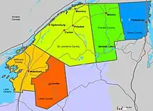 The North Country (French: Pays du Nord) is the northernmost region of the U.S. state of New York, bordered by Lake Champlain to the east, the Adirondack Mountains and the Upper Capital District to the south, the Mohawk Valley region to the southwest, the Canadian border to the north, and Lake Ontario and the Saint Lawrence Seaway to the west.[1] A mostly rural area, the North Country includes seven counties. Fort Drum, a U.S. Army base, is also located in the North Country, as is the Adirondack Park. As of 2009, the population of the region was 429,092.[2]