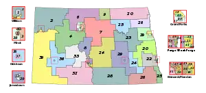 North Dakota House Districts as of 2003. House district boundaries are identical to the North Dakota Senate's districts, with two representatives elected from each district.