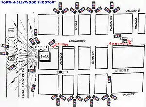 The North Hollywood shootout was a confrontation between two heavily armed and armored bank robbers, Larry Phillips Jr. and Emil Mătăsăreanu, and members of the Los Angeles Police Department (LAPD) in the North Hollywood district of Los Angeles, California, United States on February 28, 1997. Both robbers were killed, twelve police officers and eight civilians were injured, and numerous vehicles and other property were damaged or destroyed by the nearly 2,000 rounds of ammunition fired by the robbers and police.[1]