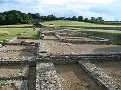The architect Henry Hakewill excavated the ruins in 1813–16.[4] Professor Francis Haverfield conducted further excavations in 1910.[4] Aerial archaeology in 1943 photographed the previously unknown plan of the southwest wing.[5] Excavations for the Ministry of Public Building and Works in 1958 revealed several phases of occupation and development, starting with Iron Age postholes indicating that the first buildings on the site were wooden.[6] The ruins were further excavated in the 1970s.[4]