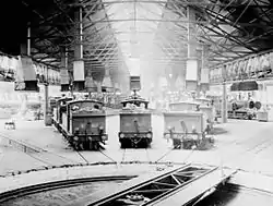 The depot was opened sometime in the 1880s by the Victorian Railways, replacing its first locomotive depot located in the Spencer Street station yard.[1] It was located beside the Railway Canal, a section of Moonee Ponds Creek that enabled the direct unloading of coal transported by sea from New South Wales. The rectangular building was built of brick and iron with three turntables located inside. There were six track entrances, two at the front from the main goods yard, three from the stabling roads, and one at the rear. A three road coal stage was located to the south of the depot, along with a number of open air stabling roads.[2]