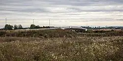 The three-span bridge is 150 metres (490 ft) long (the entire link road stretches for 900 metres (3,000 ft)), and is 12 metres (39 ft) above ground level, with 25-metre (82 ft) deep piles.[14][15] The steel beams of the bridge are 100 metres (330 ft) long and weigh 350 tonnes (390 tons) each.[10] With preparatory works completed, the bridge was lowered into position in September 2021.[16] The cost of the whole link road is £12 million, with £7.6 million being spent on the bridge alone.[3]