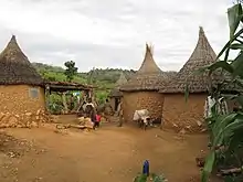Dwelling units differ from ethnic group to ethnic group, but many follow a fairly common pattern. The house of the chief often forms the centre of a village, and houses are grouped around it with granaries nearby to help the villagers survive the dry season. Various fields of crops in turn surround homes. A common house type is a round building with a cone-shaped roof. However, houses of cement brick and roofed in sheet metal are quite common in larger settlements. Villages are often clustered along the main roads.