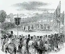 To start the construction work, there was an official sod-cutting ceremony. This took place in September 1846[16] The site chosen for the ceremony was a field in Etruria. A roped off enclosure for directors was created and the remainder of the field was reserved for invited guests. A mile-long procession headed by John Lewis Ricardo, Member of Parliament for Stoke-on-Trent and chairman of the NSR Company, formed. On Ricardo's arrival, the crowds broke through the roped off area and Ricardo was pushed and shoved. During the actual cutting he buckled the silver spade and had difficulty removing the sod. Finally, his hat blew away.[17]