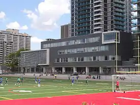 Architectural aspects of the old building, Collegiate Gothic, were preserved in the new building's courtyard. Tridel built two condominiums, 24 (25 Broadway Ave) and 27 (70 Roehampton Ave) stories high.[10] The new school was opened in September 2010, and the condominiums and the school's new field October 2011. Its gymnasium and exercise room are located in the basement. The new four-storey building, which cost an estimated $52 million,[11] features a rooftop garden, equipped science labs, a full gymnasium, change rooms, exercise room, an underground parking lot, a cafeteria, and school-wide Wi-Fi.