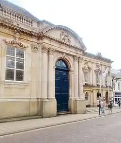 The devastation led to an Act of Parliament for the rebuilding the town.[6] Local people and businesses helped to raise around £25,000 towards the rebuilding of the town centre based around the Market Square.[30][31] Streets were widened and buildings made of brick and stone and tiled to prevent such devastation again.[18] In an act of reconciliation, King Charles II donated timber from the royal forests of Salcey and Whittlebury to help with the rebuild.[18][32] In 1678, the Sessions House and what is now County Hall were amongst the first buildings to be completed.[33] A Georgian town with new houses, shops and workshops eventually grew out of the old medieval town destroyed by the fire.[18] In 1742[34] Edward Cave opened Marvel's Mill, the world's first cotton mill to be driven by a water wheel, on the River Nene.[35]