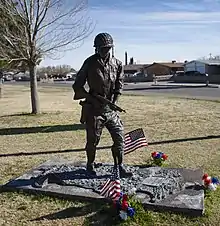 The southwest corner of the park, near the intersection of Salem and Rushing features the sculpture Days of Valor.