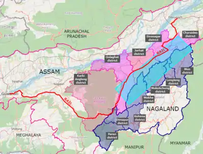 Territorial claims of Nagaland in Assam include parts of Golaghat district, Jorhat district and Sibsagar district in the Disputed Area Belt (DAB).[28] 4 interim-agreements signed in 1972 put the reserve forests of "Geleki, Abhoypur, Tiru Hills, Dessoi Valley and Doyang" off limits for activity like construction of roads.[29][30] The interim-agreements remained in place for longer than what was intended.[31]