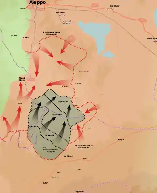 Starting on 22 October, government forces conducted heavy air-strikes against HTS positions in the area and on 24 October, a ground assault was launched[77] from the direction of Ithriya. The Syrian Army took advantage of the fighting between HTS and ISIL,[78] quickly seizing several areas from the latter.[79] The ultimate aim of the government offensive was reported to be either the rebel-held Abu al-Duhur Military Airbase in the eastern part of the Idlib Governorate[78] or to simply push out HTS from that part of Hama's countryside into Idlib.[1] The same day as the Army's ground offensive started, an ISIL infiltration attempt against HTS lines was repelled.[1] As the Army offensive was developing, clashes continued between HTS and ISIL,[80] while it was reported that fighting between the Army and ISIL had stopped as of 26 October.[1] By 28 October, more than 350 air-strikes had been conducted[77] and the military managed to capture between six and ten villages from both HTS and ISIL,[81][82] with ISIL confined to just five villages.[1] During the night between 27 and 28 October, elements of the 3rd and 4th Division of the Syrian Army were approaching to Rahjan.[47]