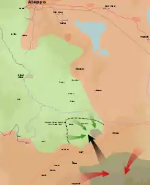 On 21 November, under the cover of bad weather, ISIL forces attacked from their small pocket HTS positions and managed to capture four villages.[103] Concurrently, an ISIL suicide car bomber also blew himself up in Rahjan.[104] ISIL continued its advances the following day, capturing another nine villages.[105][106] Meanwhile, the Army launched its finale phase of the offensive,[107] advancing to positions just several hundred meters from Rahjan.[108] At the same time, the military also attacked and captured a village and a nearby hilltop in the southern countryside of Aleppo.[109] By this point, the military captured 29 villages in the Hama countryside during the offensive.[110]