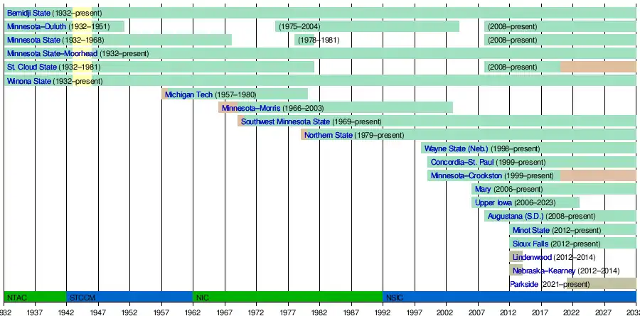 Since 1932, 18 institutions have competed in the NSIC. Although all six charter members are in the conference today, only three of them have remained in the conference for the 80 years of its existence: Bemidji State, Minnesota State–Moorhead, and Winona State.