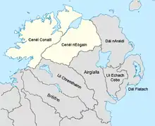 The Northern Uí Néill's over-kingdom in its earliest days was known as In Fochla and In Tuaiscert, both meaning "the North", and was initially ruled by the Cenél Conaill.[3] After the Cenél nEógain's rise to dominance, it became known as Ailech.[3]