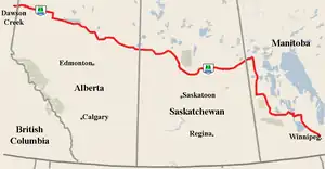The Northern Woods and Water Route is a 2,400-kilometre (1,500 mi) route through northern British Columbia, Alberta, Saskatchewan and Manitoba in Western Canada. As early as the 1950s, community groups came together to establish a northern travel route; this was proposed as the Northern Yellowhead Transportation Route. The Northern Woods and Water Route Association was established in 1974, and encouraged promotion of the route with the promise of an increase in tourist travel.[2] The route was designated in 1974 and is well signed throughout its component highways. The route starts at Dawson Creek as the Spirit River Highway and ends at the Perimeter of Winnipeg, Manitoba, after running through the northern regions of the western provinces.[3] From west to east, the Northern Woods and Water Route (NWWR) incorporates portions of British Columbia Highway 49; Alberta Highways 49, 2A, 2, & 55; Saskatchewan Highways 55 & 9; Manitoba Provincial Road 283 and Trunk Highways 10, 5, 68 & 6. The halfway point of the NWWR is approximately at Goodsoil, Saskatchewan.[4]