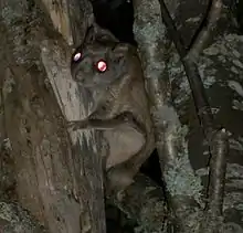 The northern flying squirrel (Glaucomys sabrinus) is one of three species of the genus Glaucomys, the only flying squirrels found in North America.[3][4] They are found in coniferous and mixed coniferous forests across much of Canada, from Alaska to Nova Scotia, and south to the mountains of North Carolina and west to Utah in the United States. They are light brown with pale underparts and grow to a length of 25 to 37 cm (10 to 15 in). They are proficient gliders but uncoordinated walkers on the ground. They feed on a variety of plant material as well as tree sap, fungi, insects, carrion, bird eggs and nestlings. They mostly breed once a year in a cavity lined with lichen or other soft material. Except when they have young, they change nests frequently, and in winter a number of individuals may huddle together in a shared nest. Unlike most members of their family, flying squirrels are strictly nocturnal.