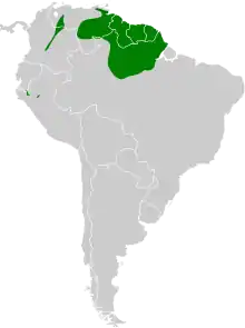 The northern slaty antshrike is found in north-eastern South America in Brazil, Venezuela and the Guianas. In Brazil, it occurs in the northeast quadrant of the Amazon Basin, (with the Guianas), and from the Brazilian state of Roraima in the west, to the states of Pará, and Amapá on the Atlantic at the Amazon River outlet. The species occurs only north of the Amazon. A disjunct population exists along the eastern slope of the Andes in Colombia and Venezuela, while two other populations exist in the drainage of the Huallaga and the Marañón River in northern Peru and far southern Ecuador. The populations in Peru and Ecuador are sometimes considered a separate species, the Marañón or Peruvian slaty antshrike (Thamnophilus leucogaster), in which case the common name of the remaining species often is modified to eastern or Guianan slaty antshrike.