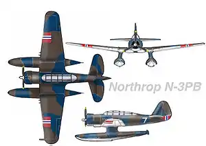 The Northrop N-3PB Nomad was a single-engined American floatplane of the 1940s. Northrop developed the N-3PB as an export model based on the earlier Northrop A-17 design.[1] A total of 24 were purchased by Norway, but were not delivered until after the Fall of Norway during the Second World War. Exiled Norwegian forces used them from 1941, operating from Iceland, for convoy escort, anti-submarine patrols, and training purposes from "Little Norway" in Canada.[2] Within two years of delivery, the design was obsolete for front-line service and the remaining N-3PBs were replaced by larger aircraft in 1943.